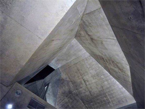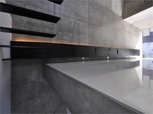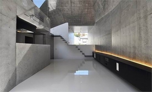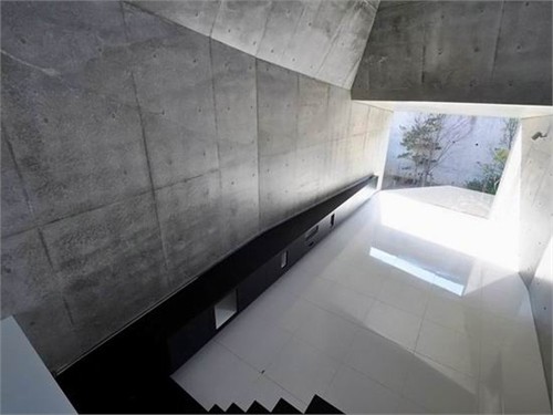 主要的起居室被布置在二層吹拔空間中。外部豐富的多面形式被延續(xù)到了室內(nèi),形成了一個復(fù)雜而多角度的屋頂效果。盡管建筑師選用了相對沉悶的混凝土飾面材料,但豐富的室內(nèi)屋頂形式和多重焦點(diǎn)在垂直方向上拓展了空間深度,創(chuàng)造了一個格外開放而空曠的起居空間。突出的天窗,巨大的落地方窗以及光滑的白色地面都盡可能的為室內(nèi)提供豐富的自然光線。