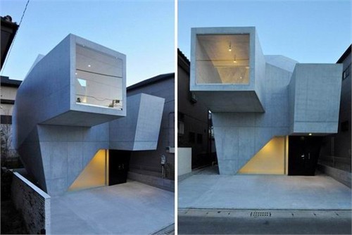 基地兩側(cè)被緊鄰的建筑包圍,這座住宅是由鋼筋混凝土建造的,形態(tài)有機(jī)多變,產(chǎn)生了許多斜面。兩個混凝土體量從臨街立面上突出,懸在入口和停車位上方。建筑師在兩個懸挑前方設(shè)計(jì)了巨大的落地窗,讓室內(nèi)能接受到充足的自然光線。