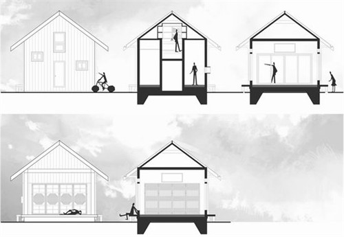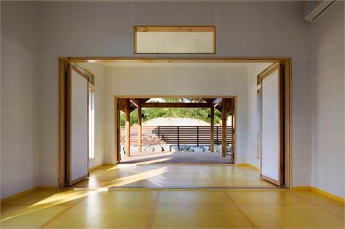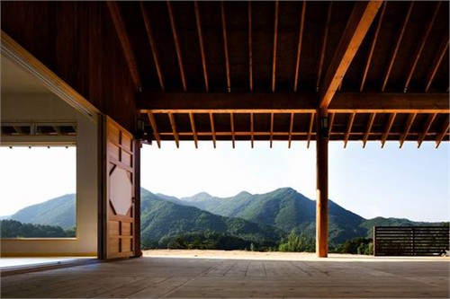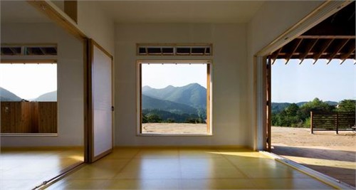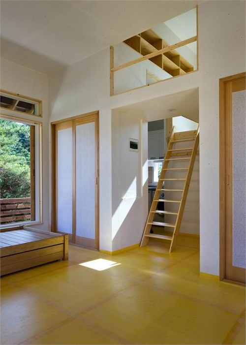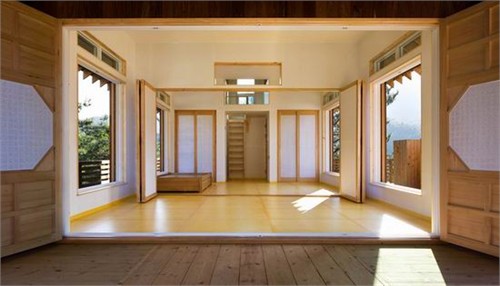 通過韓國(guó)傳統(tǒng)木構(gòu)造和鑲板木門等設(shè)計(jì)細(xì)節(jié),這個(gè)現(xiàn)代的建筑設(shè)計(jì)方案與韓國(guó)傳統(tǒng)營(yíng)造方式有機(jī)結(jié)合在一起。入口掩藏在戶外游廊下方,建筑師用一系列宣紙屏障來劃分空間,創(chuàng)造了一個(gè)毫無遮擋的開放性空間布局。住戶要通過一個(gè)梯子方能達(dá)到閣樓臥室,同時(shí)能俯瞰首層的起居空間。