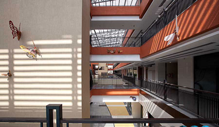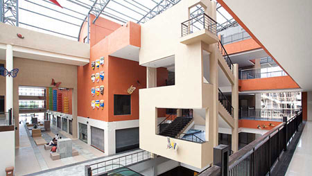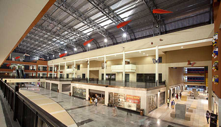 這座商場(chǎng)匯集了零售店、食品攤、娛樂(lè)區(qū)、兒童游戲場(chǎng)等。商場(chǎng)的基座有多個(gè)入口,方便人們從各個(gè)方向進(jìn)入。大型的中庭同時(shí)也是一個(gè)多功能區(qū),可進(jìn)行多種活動(dòng)。升降梯將人們帶入到建筑的各個(gè)樓層。各種大小的零售店鱗次櫛比,既有小攤位也有超市,夾雜著餐館和咖啡館。開(kāi)放式的娛樂(lè)空間設(shè)置了游戲機(jī)、保齡球場(chǎng)和其他室內(nèi)娛樂(lè)設(shè)施以及一座大型的4屏多維影院等。