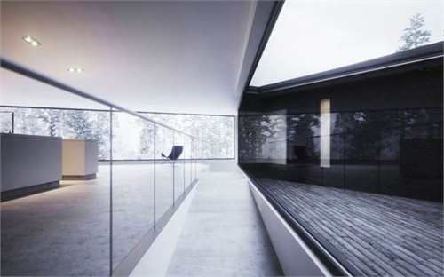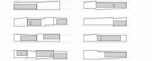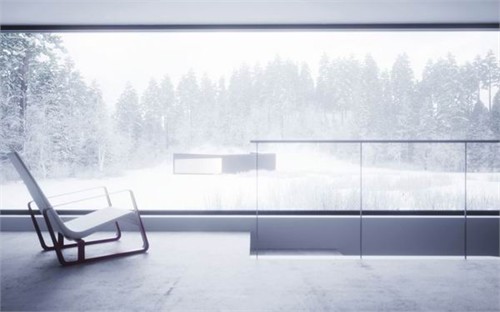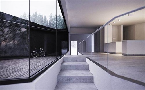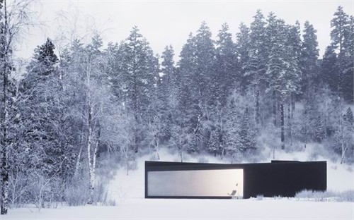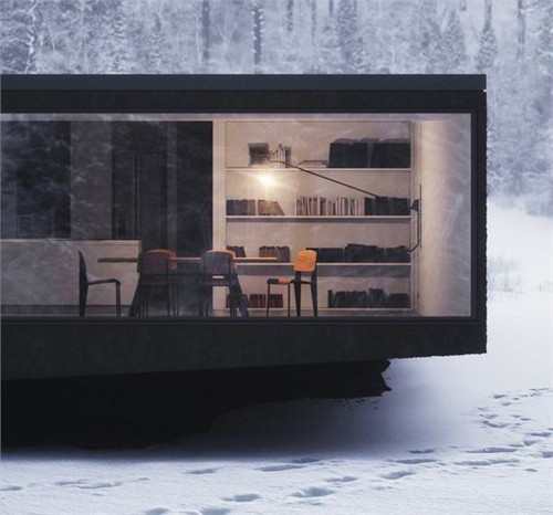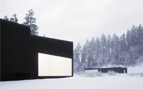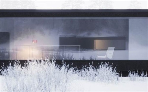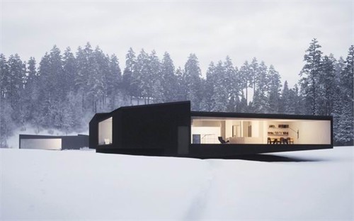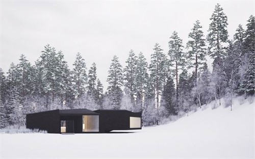地面和屋頂根據(jù)基地地形的起伏而變化,創(chuàng)造出了各種各樣的排列組合方式,它們之間由一系列坡道和樓梯相連。所有的雨水都會直接流入一個線形水池中,居住者可以方便的從各自的家進入。基地周邊種植了許多漿果、蔬菜和小麥。連續(xù)的水平長窗將周邊建筑和樹林的景色映入室內。立面上涂有一層厚厚的黑漆,與周圍白雪皚皚的景象形成鮮明對比。