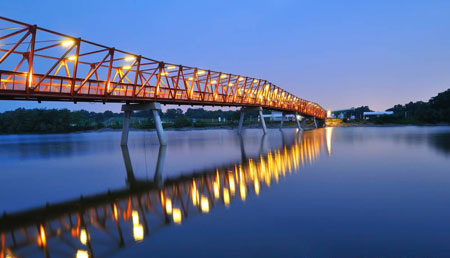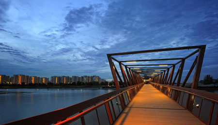 由于跨度較大,打入河床的樁子數(shù)量可以減少,對自然環(huán)境的影響降到最低。步行橋采用超節(jié)能的10瓦LED直線型照明帶,取代了傳統(tǒng)的熒光燈。
