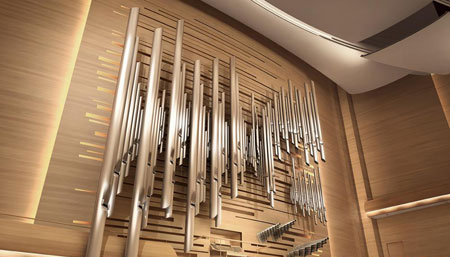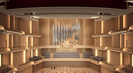 音樂廳的座位有1900個(gè),采用傳統(tǒng)的鞋盒形式,但有了現(xiàn)代化的布局。墻面有砂紙般的裝飾,并以高中低三個(gè)梯度來區(qū)分:低頻區(qū)像扇貝一樣排列、中頻區(qū)插入了水平方向的板條,而高頻區(qū)則全部是水平方向的木質(zhì)板條。