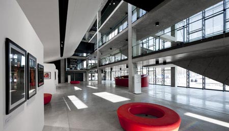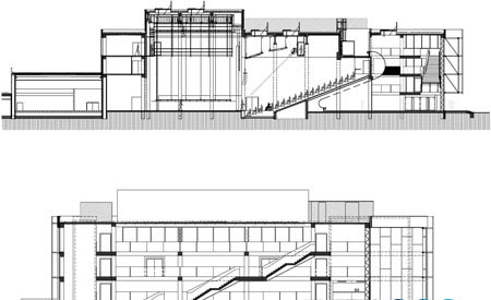 文化中心的大廳可容納554人,這也是唯一不需要日照的功能空間。它有點(diǎn)像"盒中盒",與建筑中的其他部分是分離的,采用特殊技術(shù)后它可轉(zhuǎn)變?yōu)閯龌蚴且魳窂d。所有的輔助功能空間放在了圍繞大廳的U型樓層里,從那里還可看到周圍的景色。