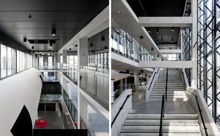 混凝土搭建的樓體連接著所有功能區(qū),酒吧和休閑廳都有戶外露臺(tái),能觀賞到市中心和車站的景象。為年輕人準(zhǔn)備的舞池和音樂廳能容納500人。