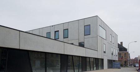 青年中心用預(yù)制混凝土澆筑,某些部分增加了第二道立面,用作遮陽板。隨著時(shí)光流逝,銅質(zhì)紗網(wǎng)將染上淡綠色的銅銹。兩道立面之間的走廊用于建筑的維護(hù)。內(nèi)部空間平實(shí)簡略,大廳和座椅采用明亮的紅色,代表著伊普爾跳動(dòng)的文化之心。