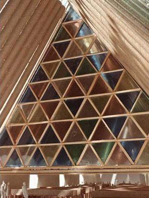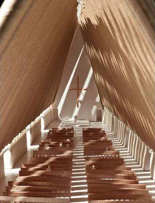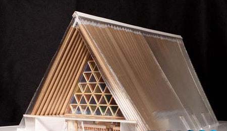 坂茂事務(wù)所用當(dāng)?shù)爻霎a(chǎn)的紙板制作出長(zhǎng)度相等的管子,共有86根,形成一個(gè)三角形狀,高度為23.8米。該事務(wù)所表示,由于幾何形狀要由原先的教堂正面等因素決定,因此每個(gè)紙管的角度都要逐步調(diào)整。這座教堂可容納700人,也能用做活動(dòng)空間和音樂廳。