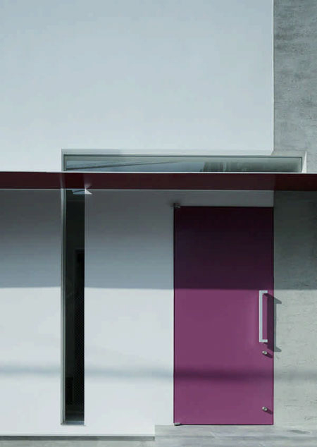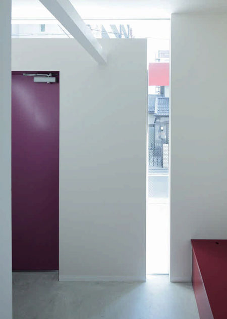 這座房屋住著四個(gè)人和兩只貓,樓層面積僅有103平方米。它處于一個(gè)小型停車場(chǎng)的角落里,看上去孤零零的,如同海邊被擱置的一張桌子。它的外墻采用了砂漿和黑墨,并以紅色和紫色來(lái)點(diǎn)綴,小型的窗戶隨意設(shè)置在立面上,而屋頂則是三角形的。立面上有一個(gè)薄薄的鋼質(zhì)屋檐,并有一個(gè)鎖眼狀的開口橫跨在屋檐上。門是酒紅色的,配合立面上的圖案,看上去就像是一只珠寶盒上的美麗裝飾。