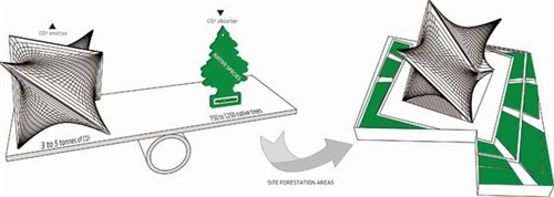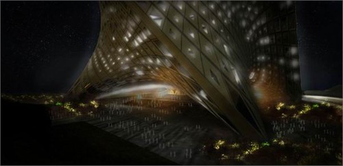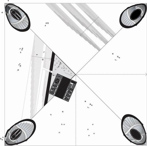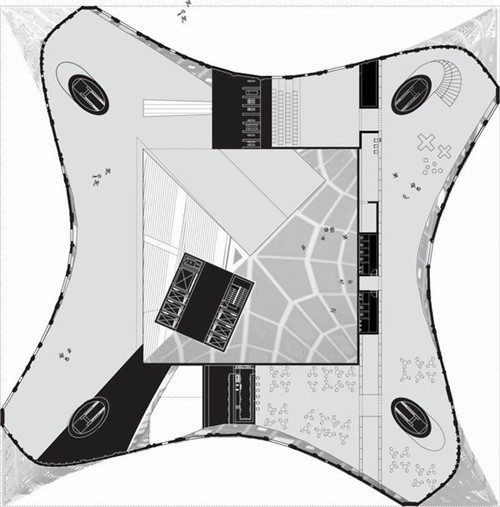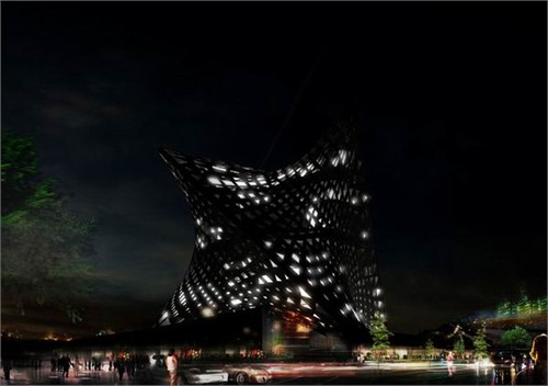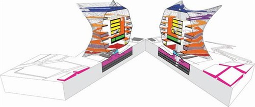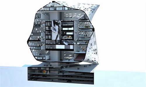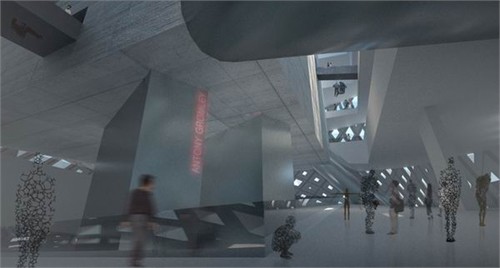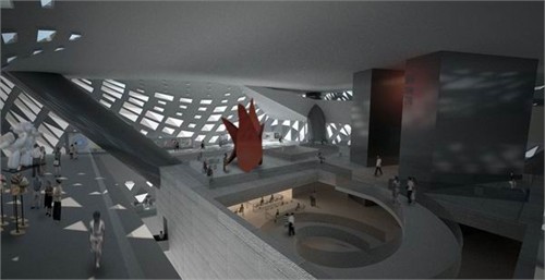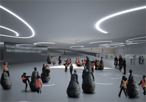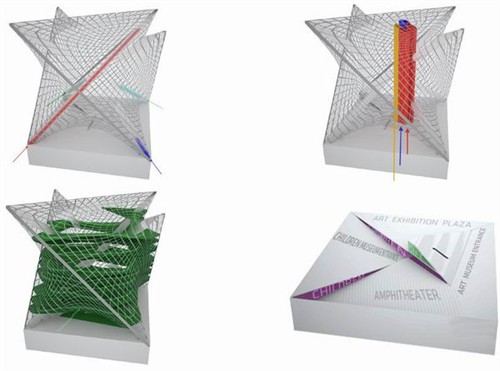 葡萄牙建筑事務(wù)所OODA憑借他們設(shè)計(jì)的方案獲得了臺灣“新北市立美術(shù)館概念設(shè)計(jì)國際競賽”的優(yōu)選獎(jiǎng)。這個(gè)項(xiàng)目位于臺灣臺北市,建成之后的美術(shù)館將成為城市中心區(qū)的新地標(biāo)性建筑,所以需要一個(gè)創(chuàng)新的先鋒設(shè)計(jì)概念。由OODA設(shè)計(jì)的方案包含兩個(gè)超立方體;一個(gè)90度直角的立方體被放置在一個(gè)稍大一點(diǎn)的扭曲的方盒子中。參觀者要通過懸掛在頭頂?shù)墓靶瓮獗砥ず痛怪彪娞葸M(jìn)入美術(shù)館內(nèi)部。
