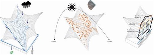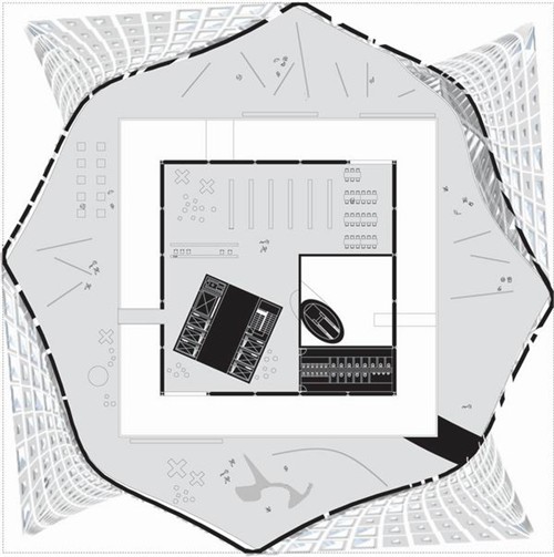 博物館的畫廊被安排在一個(gè)連續(xù)的邊緣坡道上,這一空間圍繞著藝術(shù)資源中心螺旋向上。行政管理區(qū)則位于建筑的最頂層,而兒童博物館位于建筑底層。在內(nèi)部布局交叉的地點(diǎn),一系列連續(xù)的金屬板從一個(gè)角落延伸到另一個(gè),支撐了整個(gè)外部結(jié)構(gòu)。外表皮包裹在主要的承重柱子上,形成了一個(gè)雙曲線形的玻璃立面結(jié)構(gòu),這種表皮結(jié)構(gòu)可以幫助收集雨水、放置太陽能光電板并安裝活動窗以促進(jìn)室內(nèi)通風(fēng)。建筑周圍的園林區(qū)域內(nèi)種植了超過750~1250棵樹木以吸收各種設(shè)施排放的二氧化碳廢氣。