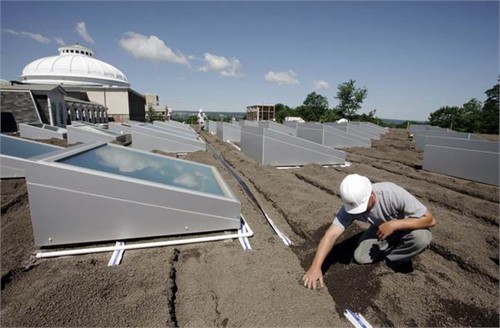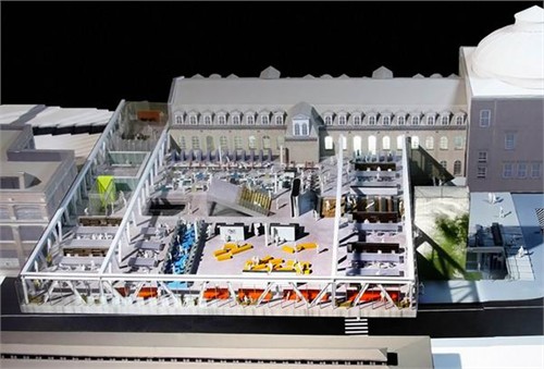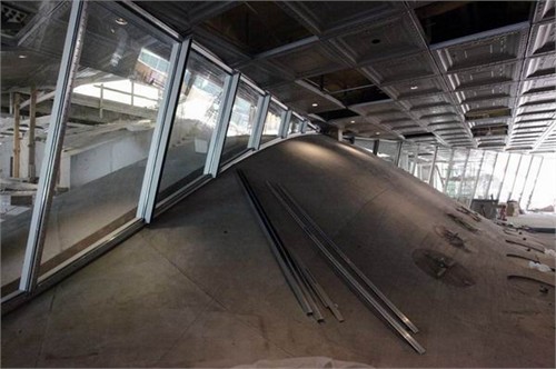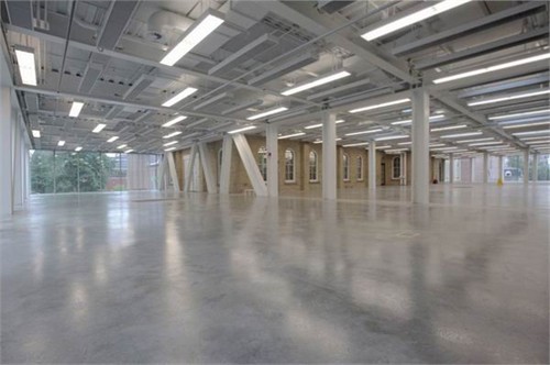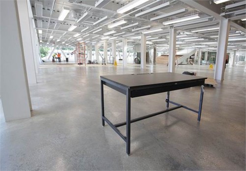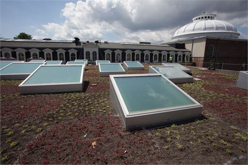 新建筑的頂層采用了開放的布局形式,里面布置了一系列研究室和工作空間。立面選用了落地玻璃窗,為工作空間提供了充足的自然光線。綠色屋頂上排布的網(wǎng)格天窗也促進了工作室的空氣流通。