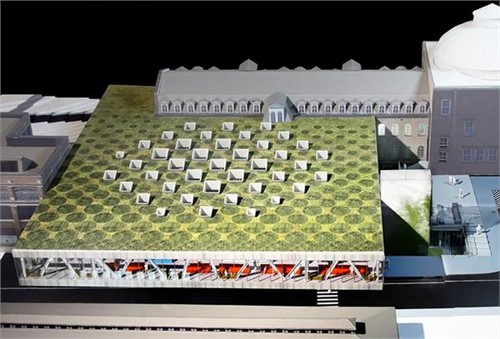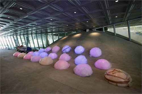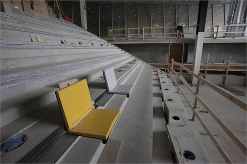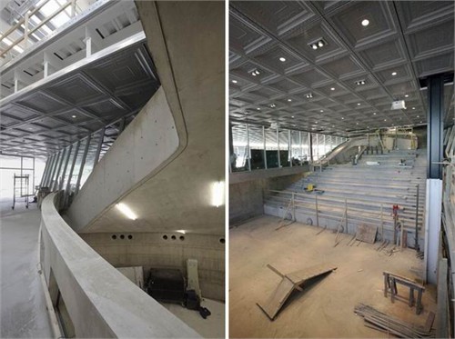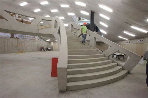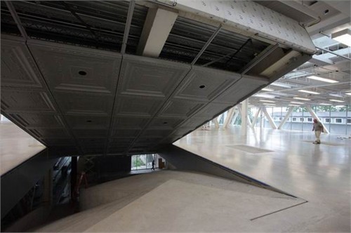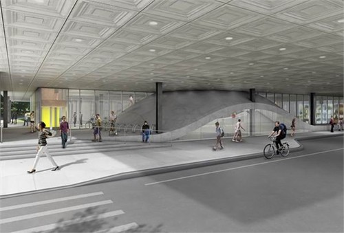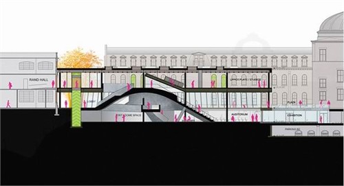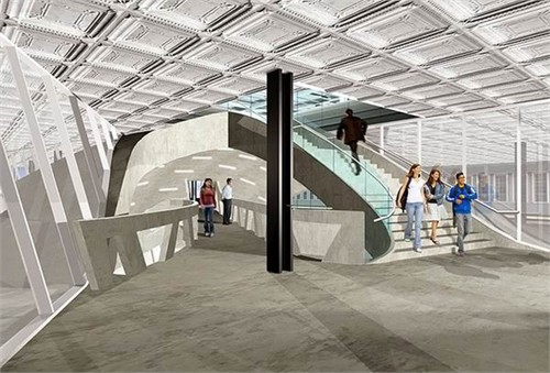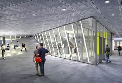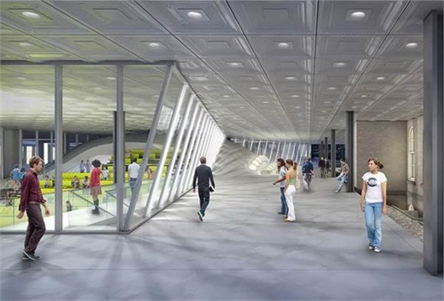 新建筑被插入到rand、sibley、foundrys和tjaden四座會堂之間。這個方案的設計重點是促進這幾座建筑之間的相互交流,在一段時間內(nèi)保持空間的靈活性。首層用來舉行各種活動,建筑師選用了完全透明的玻璃表皮,人們可以透過玻璃俯瞰下沉報告廳內(nèi)的情況。為了適應各種功能要求,局部樓板像小山丘一樣凸起,計算機實驗室和會議室被放置在凸起樓板的下方,而報告廳的觀眾席則隨著彎曲下降的樓板而漸漸降低;一部分凸起樓板從建筑外表皮穿出,與室外LED座椅結(jié)合,創(chuàng)造了一個有趣的公共休憩空間,而另一部分樓板則穿透了頂部的水平體量,形成了一個通往其它空間的入口。