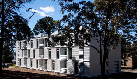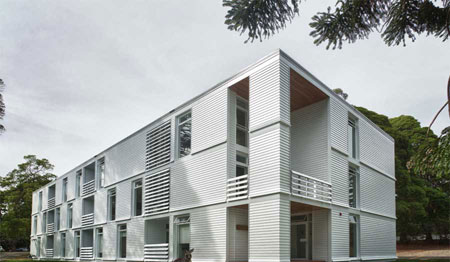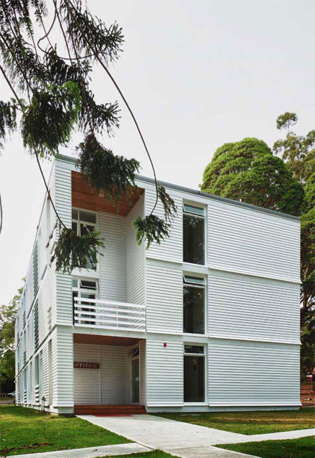 由于1970年代建造的三層磚石建筑與原有的優(yōu)雅木質和陶瓦建筑不太協(xié)調,BVN事務所對其進行了改造,賦予自身的建筑語言,并沿用了白色護墻板和垂直分布的窗戶以微微彎曲的木質裝飾條。內部空間采用高性能的環(huán)保裝置,不需要機械通風便可營造舒適的起居空間。磚石薄片成為建筑的隔熱板,并以磚砌的內層墻面來承重,輕型的通風護墻板則作為外層墻面。走廊上設置了天窗,將自然光線和交叉通風帶入了公共空間。