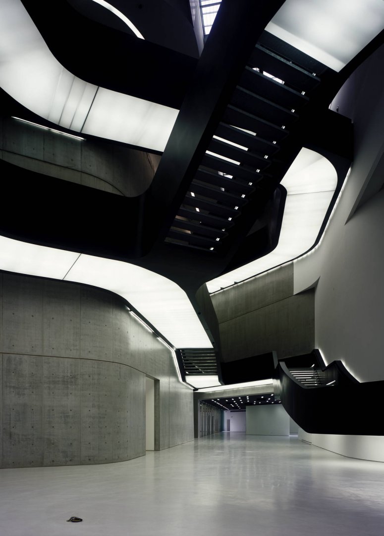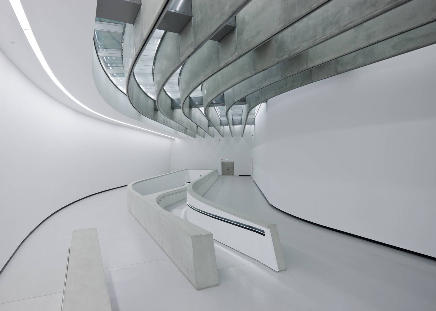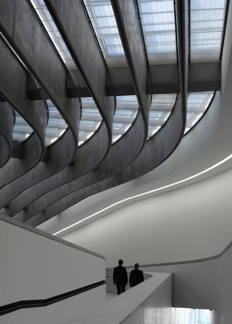 這次開放活動中,人們可以感受到純粹而空曠的建筑空間,因為隨后藝術(shù)品會在冬天完成安裝和擺放。而正式開幕儀式定在2010年4月的某天,到時建筑會展示出一個更加豐富的形象。扎哈曾表示,該博物館“并不是一個容器,而是一個藝術(shù)品營地”,在這里走廊和天橋相互疊加和連接,創(chuàng)造出來了一個具有生機的動感空間。盡管該建筑的功能清晰,在平面上組織合理,但尋求空間的靈活使用性仍是該設(shè)計的主要目標(biāo)。空間的連續(xù)性設(shè)計避開了大量的墻體劃分和干擾,為建筑內(nèi)的多樣動線和臨時展示提供了良好場所。進入博物館的中庭,混凝土弧墻、懸浮的黑色樓梯和采納自然光線的開敞天花,這些該建筑的主要元素映入眼簾。借助這些元素,扎哈“力求創(chuàng)造出多視點和分散幾何體的新型空間流動性,以此來象征現(xiàn)代生活的紛雜動感。”