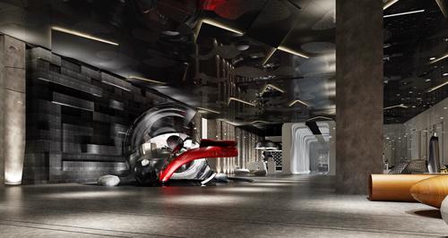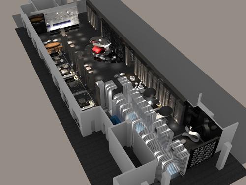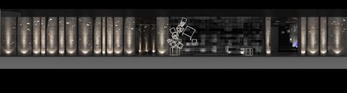 如雕塑般的立柱借助形式節(jié)奏感體現(xiàn)的微妙張力增加了空間的維度。鋼琴區(qū)的背景如堅硬的巖石隨著音樂跳動的LED燈光象征性地隱喻浪花和巖石的渾厚、灑脫,在虛與實、黑與白的空間中一顆如珍珠般飄逸的形態(tài)成為出戲、入景的地方。