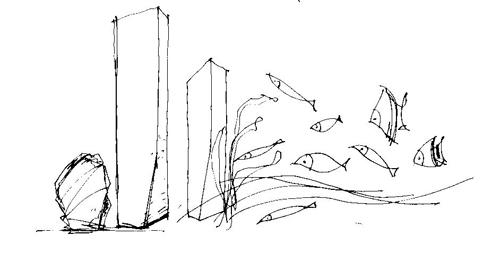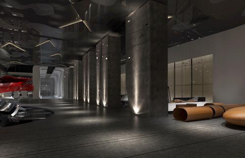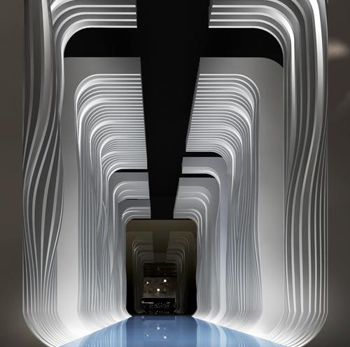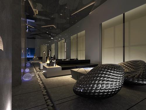By the subtle tension of the form of rhythm, the sculpture-like posts increase the dimension of space. The background of piano area just like hard rocks shows the symbolic metaphor of sounding spray and rocks for the beating LED lights with the music. The elegant form like a pearl spreads its magic in spaces of falseness and truth or black and white.