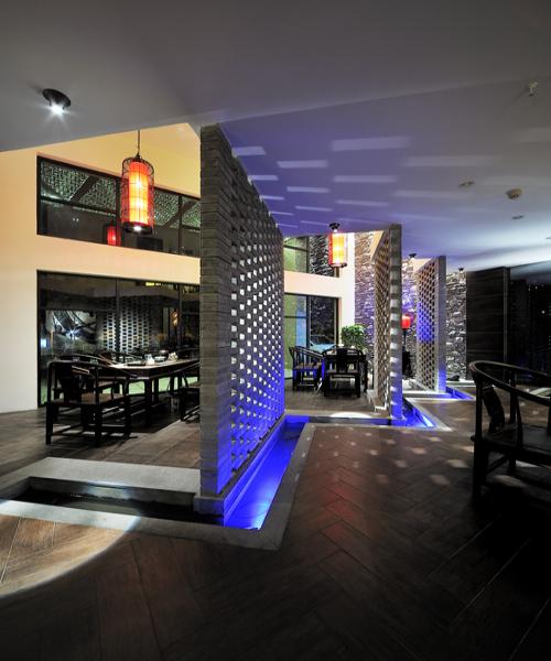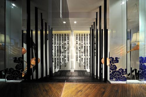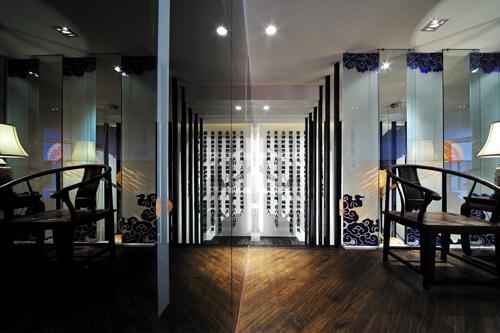 進廳左側(cè)的品茶區(qū),設(shè)計師將一片片青磚壘出三堵鏤空間的隔墻,分別對應(yīng)著三張茶桌,隔出三間因方位錯落而區(qū)分,但卻隔而不斷的“包廂”,特殊的處理手法讓同一空間出現(xiàn)“這里”與“那里”的不同感官享受。茶館主體區(qū)域的地面鋪以青石板及仿古磚,粗獷的自然紋理顯得厚實而流暢,仿佛劃滿了時間的痕跡。為了緩和這些硬朗的材質(zhì),設(shè)計師在細節(jié)處極為用心,不管是行云流水的“茶”字、藤編的燈籠、裝飾玻璃上的祥云圖案,還是那些做工精良的仿古家具、精美絕倫的青花瓷器這些細微之處的累積都讓空間顯得更為飽滿。