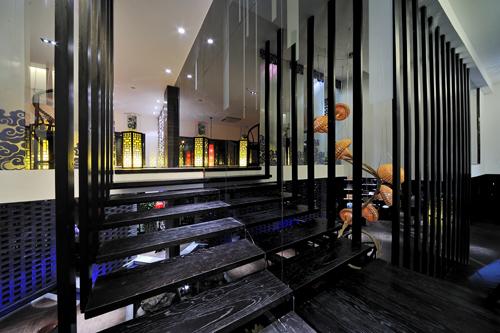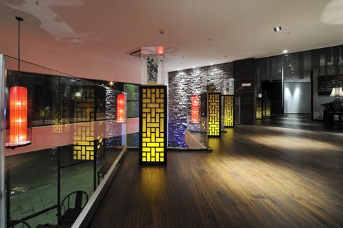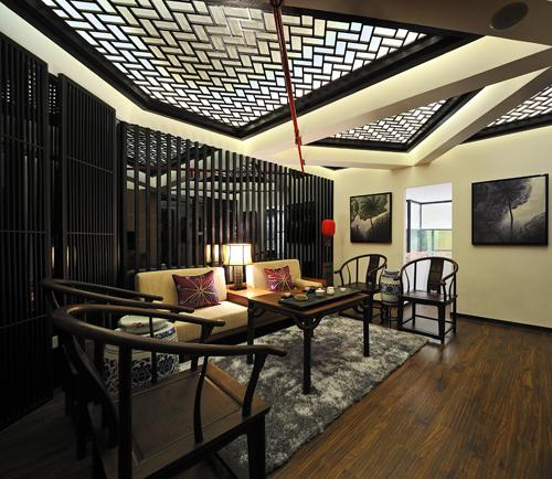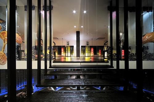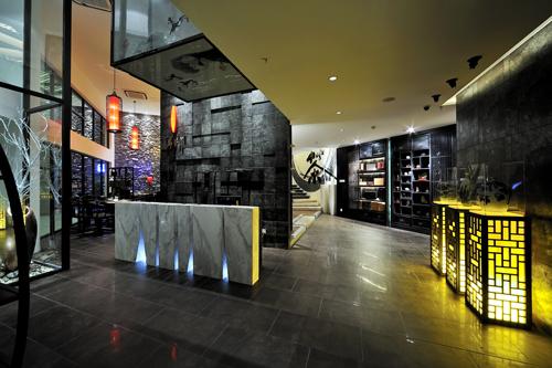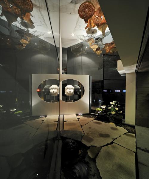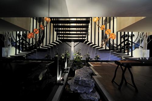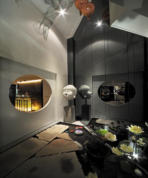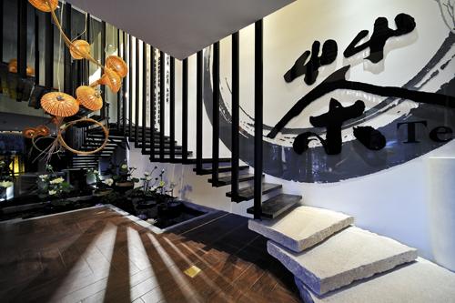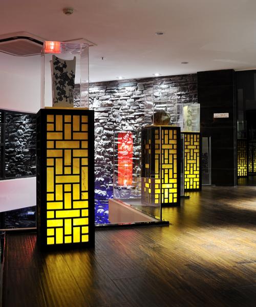 茶館的玄關(guān)處是一面以古樸的石磚不規(guī)則拼貼面成的背景隔墻與門邊漆成白色的樹枝、泛著暖黃色光的燈臺攜映成趣,剎那間便抓住了人們的視線。茶館的一樓大廳部分空間為挑空式設(shè)計,一個方形玻璃吊燈如同一個透明小屋懸于接待臺上方,極為別致,并且在上下映射之間擴大和拔高了空間的結(jié)構(gòu)。而一旁的佛像、燈籠及窗邊的造景等獨具中式風格的軟裝飾品,也一并被設(shè)計師規(guī)劃到此處,成為輔助空間的點睛之筆。