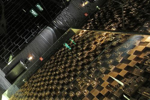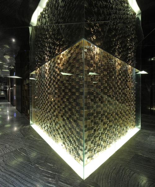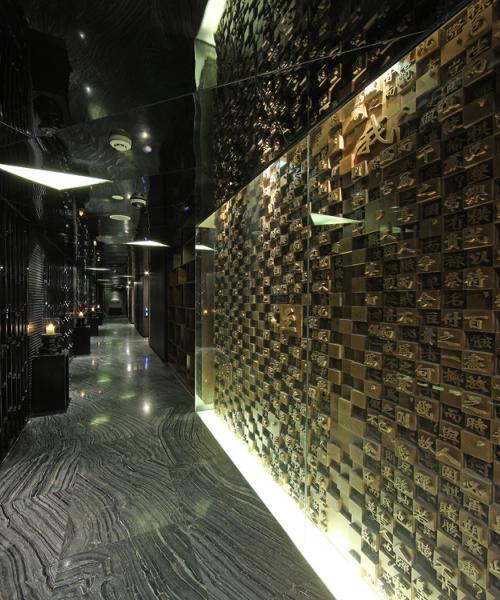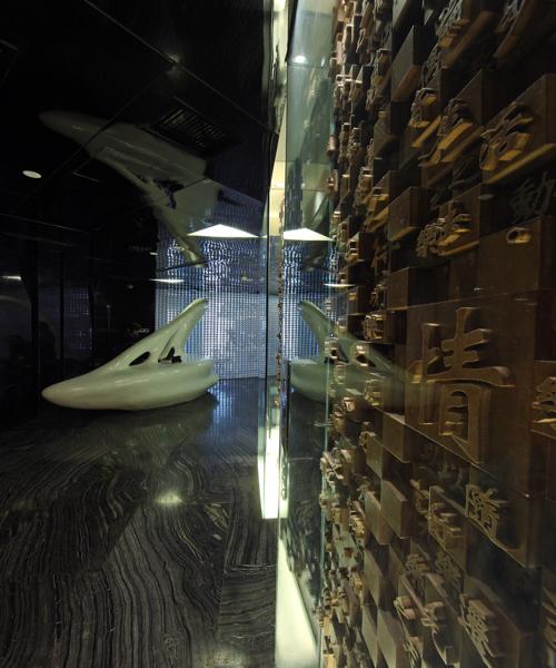 設(shè)計師把接待廳設(shè)在會所的高層(整幢樓的腰部),會員從電梯出來透過充滿力量感得幾何造型大理石柱之間的空隙,看到樓外的景觀,從那一刻起,一段充滿詩意的心靈之旅即將展開。黑金龍大理石地面,黑灰色如流水般的紋理從電梯間開始延伸。光潔的理石質(zhì)地,柔順的流水紋路碰撞出雙重的美感。中國四大發(fā)明的鉛字印刷被以現(xiàn)代材質(zhì)演繹,“道德經(jīng)”的雕刻文字被設(shè)計師平面排序,造型夸張,強(qiáng)調(diào)尺度感的中式椅子,用亞克力來表現(xiàn),似乎在告訴來這里的會員完全不一樣的中國元素的解讀方式。