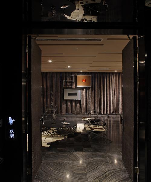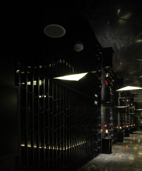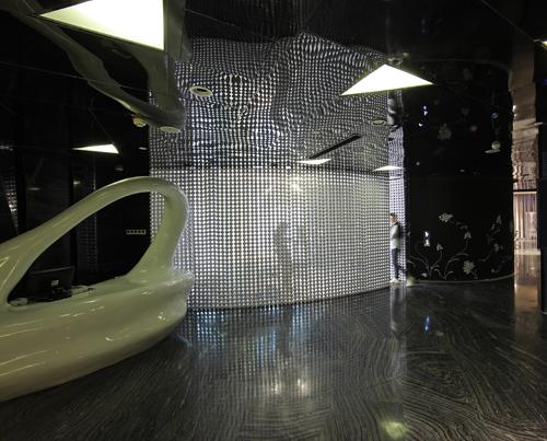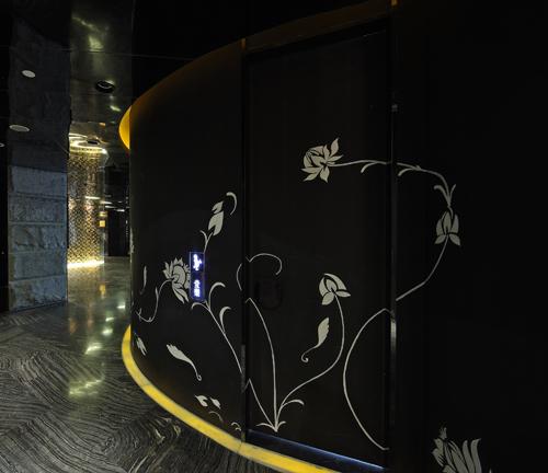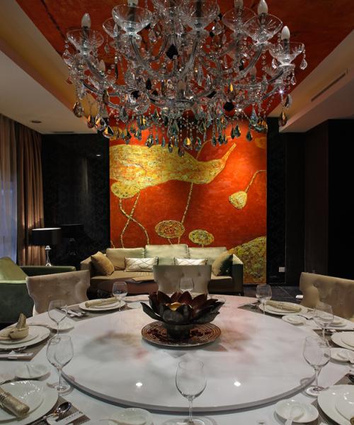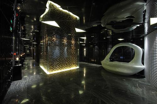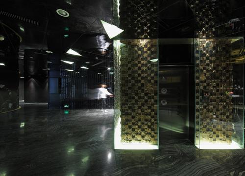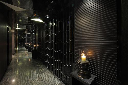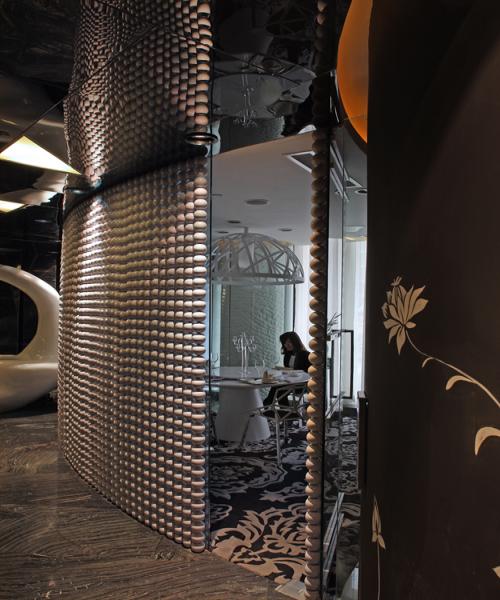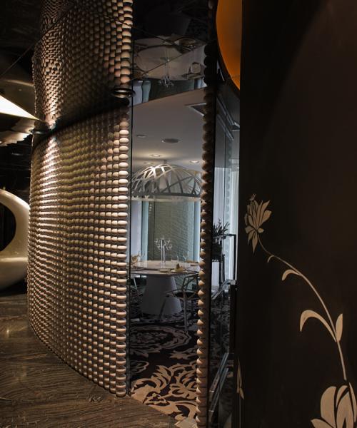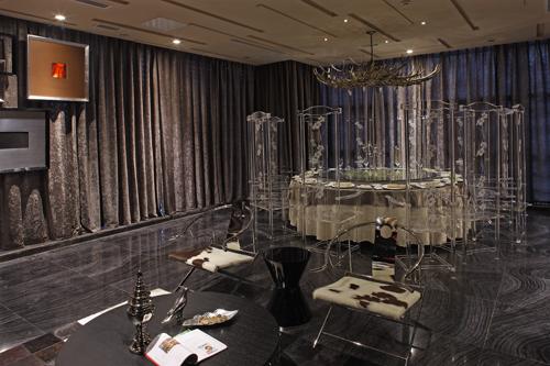 設(shè)計從東方傳統(tǒng)元素中汲取靈感,大膽的加以“破壞”和“否定” ,從而創(chuàng)造出一個全新的意念,一個具有時代氣息的意念。從對傳統(tǒng)東方元素的偷窺中……在殘破的被剝離的傳統(tǒng)符號中抽象表達(dá),尋找出最性感的地帶,文化、藝術(shù),黑色、白色的表象背后,肆意地表達(dá)一種藝術(shù)的力量,無形中增強(qiáng)了空間的神秘張力。中國傳統(tǒng)磨漆畫藝術(shù),濃烈的紅色大漆,飽滿深沉而斑駁,肌理感含蓄內(nèi)斂。傳統(tǒng)紫砂工藝的提梁壺被大膽“破壞”;以當(dāng)下的設(shè)計形式演變成既具功能性的接待前臺又如大廳中的純白色當(dāng)代裝置藝術(shù)品;一顆顆珍珠透過玻璃和光影的洗禮,有序地拉出優(yōu)美的?。粨u曳的燭光、燭臺;樸拙的石材栓馬樁;金屬裝飾品;以及青花瓷的圖案。設(shè)計師利用色彩、材質(zhì)、光影以及造型的穿插、對比、和諧所產(chǎn)生的張力,來引起來者的共鳴,傳達(dá)出空間要述說的東方內(nèi)在精神。