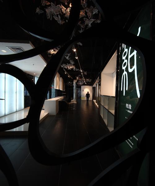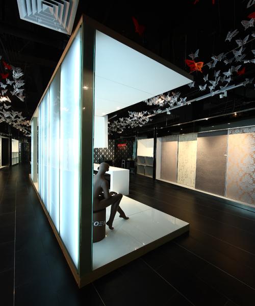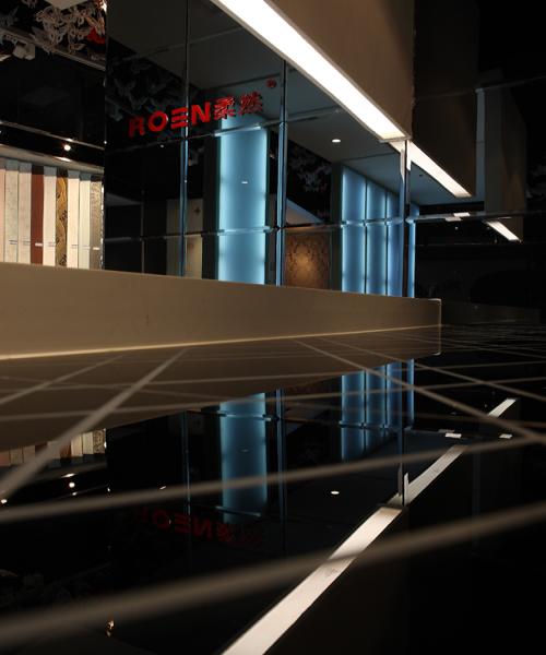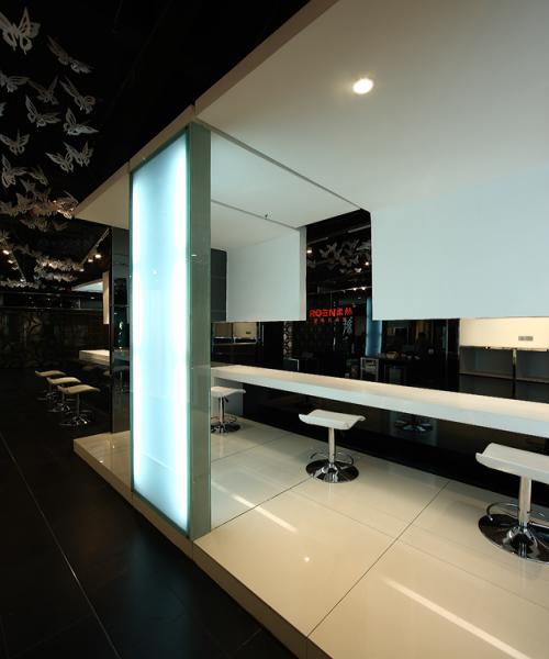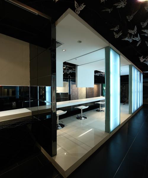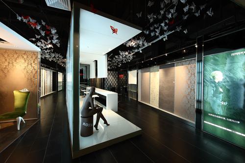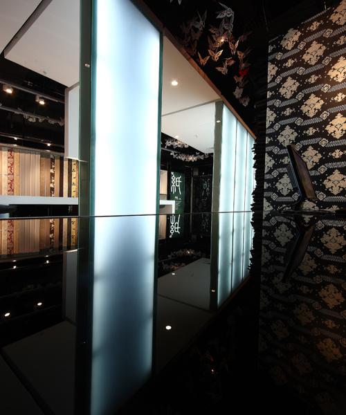 壁紙的展示是空間的主要功能和目的,而壁紙本身就有相當(dāng)豐富的形式,有各種各樣的色彩、質(zhì)感和圖案,為了襯托和凸顯壁紙的視覺(jué)核心意義,設(shè)計(jì)師選擇了色感單純的黑白調(diào)打造空間,再配合鏡面的元素進(jìn)行拓展,使得空間時(shí)尚、干凈,并具有深邃的觀感。實(shí)體的發(fā)光墻,配合一些線條構(gòu)成的穿插、鏡面的隔斷,再呼應(yīng)全黑裸頂上懸掛的剪紙蝴蝶,虛實(shí)相生,造就一個(gè)與柔然品牌內(nèi)涵最為契合的展示空間。