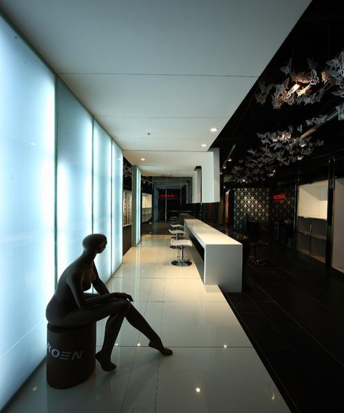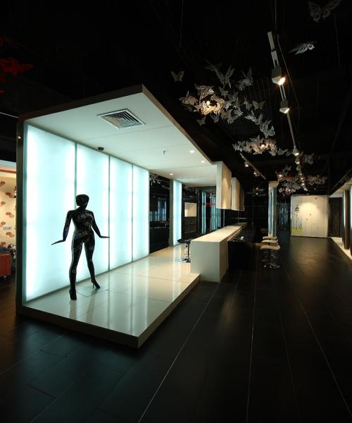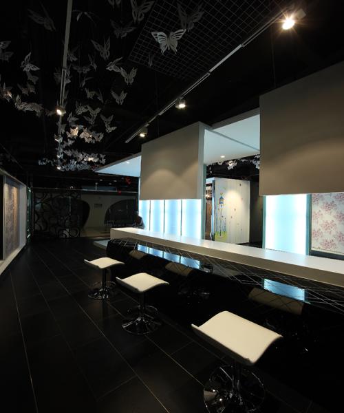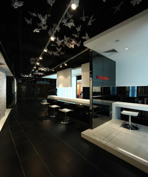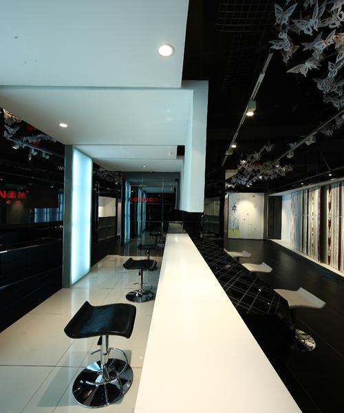 設(shè)計(jì)師對(duì)吊頂采取了不加處理的手法,任其裸露出原始的黑色肌理,而尤為匠心獨(dú)運(yùn)的是其在裸頂上懸掛了剪紙蝴蝶,幾種不同規(guī)格的蝴蝶耗費(fèi)了十天的制作周期以及整整兩天兩夜的精心布置懸掛,少量的紅色蝴蝶點(diǎn)綴在大量白色蝴蝶當(dāng)中,疏密有致、生動(dòng)柔美,在光影變化中,蝶群似乎真的在翩翩飛舞,營(yíng)造出了一種浪漫、迷離的氛圍。蝴蝶用剪紙形態(tài)進(jìn)行演繹,是對(duì)中國(guó)民俗文化中剪紙藝術(shù)的演變運(yùn)用,將富有民族文化底蘊(yùn)的元素融入到現(xiàn)代時(shí)尚的空間風(fēng)格中;與此同時(shí),蝴蝶還是柔然logo的造型,“飛舞”于店堂各處的剪紙蝴蝶,無(wú)聲地闡釋著柔然的品牌內(nèi)涵,不經(jīng)意間在人們心中豐滿了柔然的品牌形象。