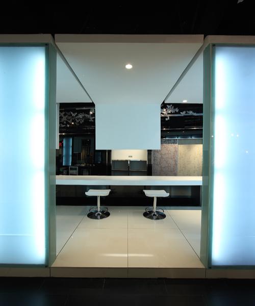 此案中,在一個(gè)大空間的中間,兩個(gè)長(zhǎng)形“小盒子”斜斜穿插構(gòu)成形式感強(qiáng)烈的結(jié)構(gòu)主體。兩個(gè)小盒子實(shí)際上并非規(guī)矩完整,而是通過(guò)發(fā)光墻與臺(tái)面的穿插構(gòu)成造就,挖掘出空間更深刻的結(jié)構(gòu)張力。