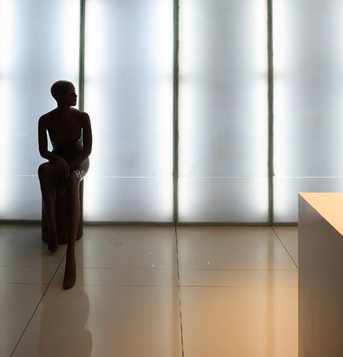 壁紙的時(shí)尚定位還與時(shí)裝的理念有著異曲同工之妙,設(shè)計(jì)師在此借鑒、融合了時(shí)裝的時(shí)尚元素以及時(shí)尚發(fā)布的概念,除了“時(shí)尚藝術(shù)發(fā)布廊”,還通過(guò)長(zhǎng)形通道兩頭各一的黑色model來(lái)演繹,兩個(gè)model一站一坐,相映成趣,其黑色的基調(diào)完美融入空間的整體感中,而身上的“柔然”英文logo,更體現(xiàn)了設(shè)計(jì)師處處留心品牌形象的塑造。Model的出現(xiàn),頓時(shí)打破了點(diǎn)線面的單一表現(xiàn)形式,使空間內(nèi)涵立體而生動(dòng)起來(lái)。