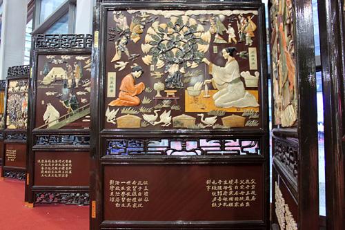 以石材雕刻出來(lái)的栩栩如生的畫(huà)面平緩地闡述孔子的生平事跡,石作鑲嵌在古香古色的木頭中間,這套屏風(fēng)讓人不由得駐足欣賞。