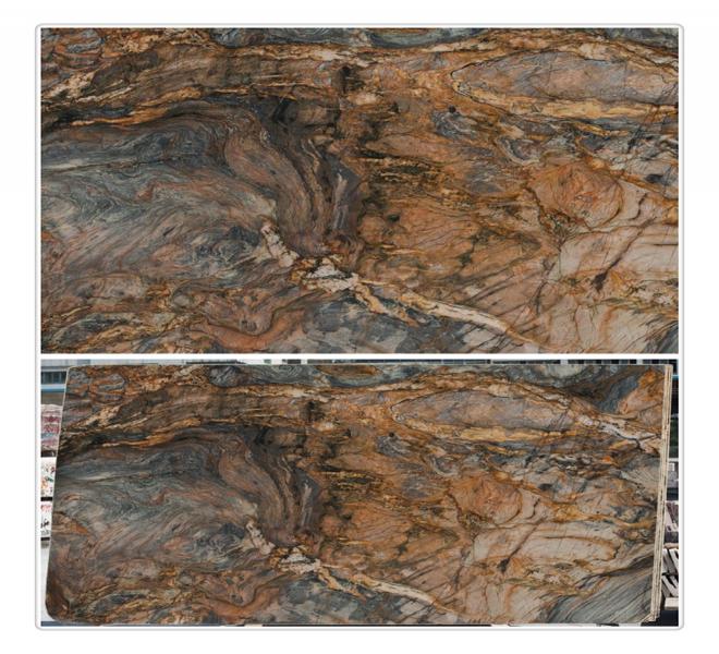 上榜理由:流金溢彩,結(jié)構(gòu)具有層次感,金銀色片狀結(jié)構(gòu)在灰黑色的紋理下閃閃發(fā)光,正如一片片金子蜿蜒曲折靜靜地流淌,微風佛過之后金光閃閃;走進一看,稀稀疏疏的天藍色塊狀晶體更是天然的點綴,還有頂層的棕色園斑點均勻分布其中,使板面更具立體感。