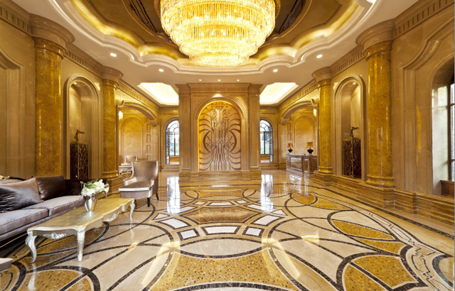大堂看著好金碧輝煌的,水晶燈、地上的精美石材拼花看著好大氣