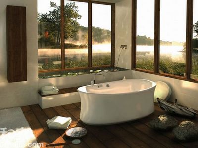 具有一定日式風(fēng)格的衛(wèi)浴間設(shè)計(jì),兩面大型的落地窗,形成了極好的視野。浴缸旁擺放上幾個石頭、樹枝,給這個衛(wèi)浴間帶來了原始的味道。