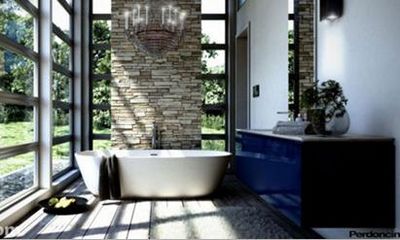 具有創(chuàng)意感的衛(wèi)浴間設(shè)計(jì),右側(cè)的墻面宛如數(shù)碼線路板,十分具有創(chuàng)意。將浴缸嵌入到兩面強(qiáng)之間,整面大玻璃,當(dāng)你在沐浴時看綠樹成蔭,心情也變得輕松起來。