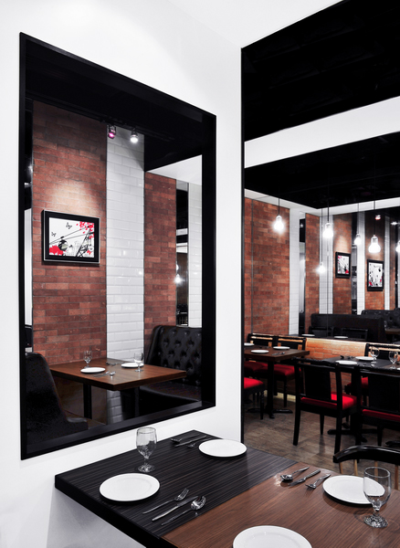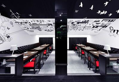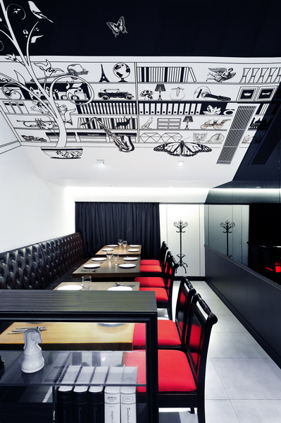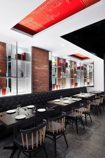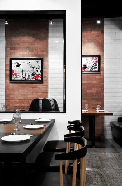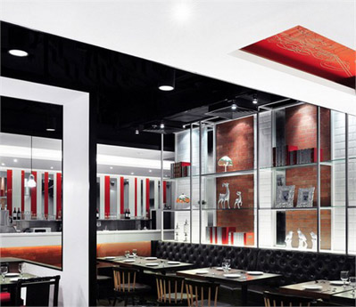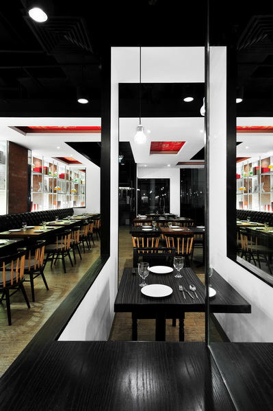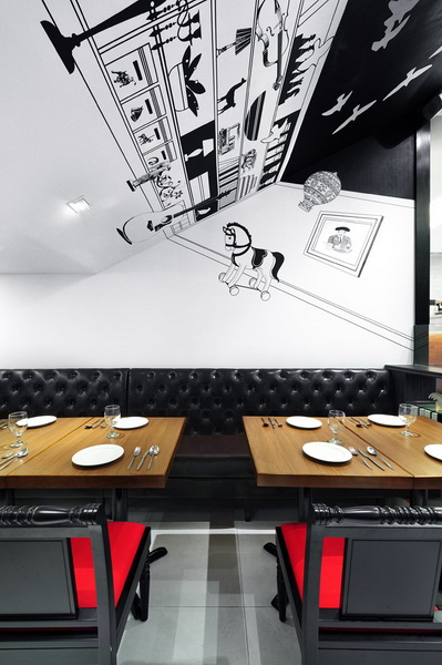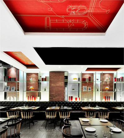 餐廳設(shè)計(jì)素材采用原材料,例如木材地板和墻身的紅白磚塊,帶出一種不經(jīng)修飾和陳舊的味道,天花和框架結(jié)構(gòu)的紅白油漆形成,但色調(diào)同時(shí)又和墻身的紅磚互相呼應(yīng),而且物料與原材料形成簡(jiǎn)單對(duì)比,再加上居家環(huán)境意念的插圖,新舊元素并存,成功地帶出視覺(jué)效果。