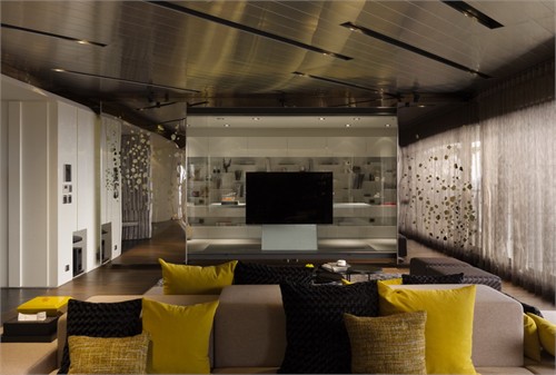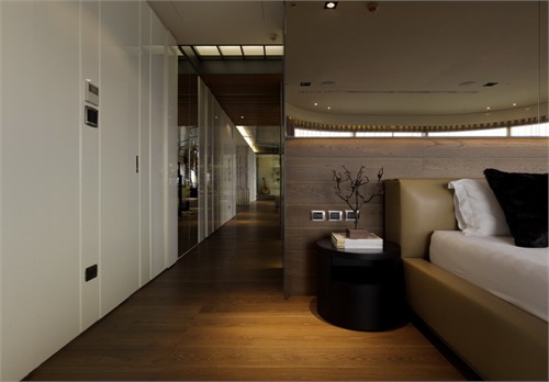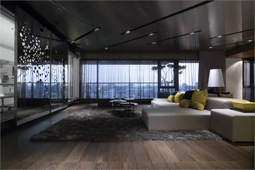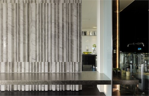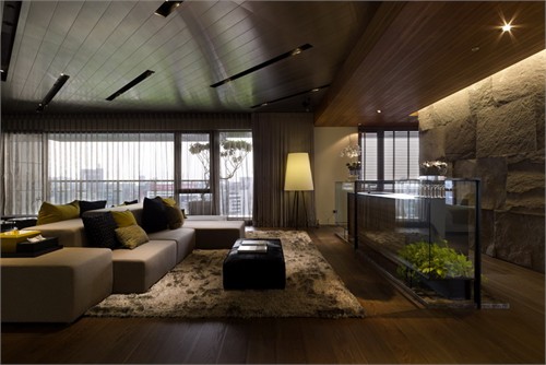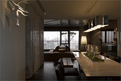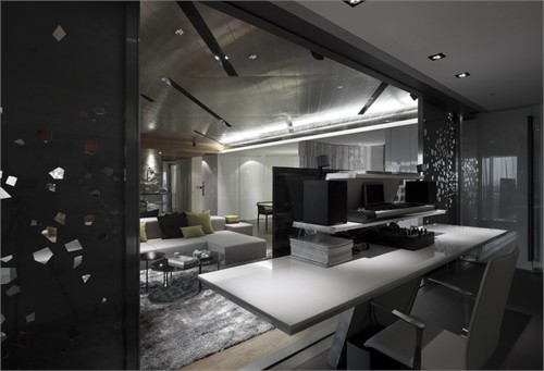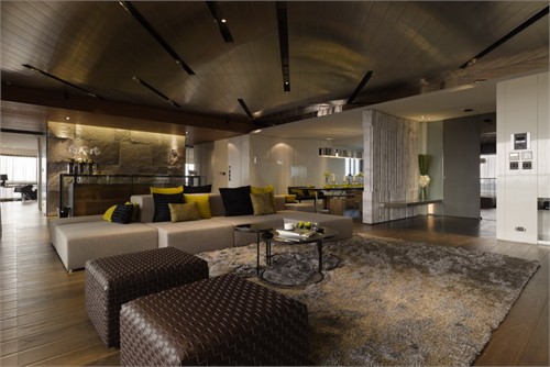 空間由一個自由平面展開,一道清晰的軸線貫穿主要空間??蛷d沙發(fā)的配置決定了整個調性,是愉快的面貌,一面面對電視主墻,一面面對長形吧臺……以客廳沙發(fā)為空間重心,連結所有開放空間,空間之中,兩道主題:鏡面白鐵與原始石皮,冷峻天花與溫潤地板。
