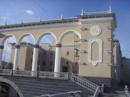 俄羅斯芭蕾舞劇院,主要是應(yīng)用了地面拼花、羅馬柱、異型樓梯、花線等十多種材料