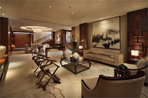 行政酒廊位于酒店的最高層,兩根雕刻精美的通高玉柱靈感來源于中國傳統(tǒng)的銀藝術(shù),在行政酒廊的入口處迎接客人的到來。中國水墨畫設(shè)計(jì)的地毯,暗色的木地板和具有中國木制結(jié)構(gòu)的背光天花板共同營造了這個優(yōu)雅的空間??臻g了以皇室特有的金與黑為主色,采用了傳統(tǒng)的木質(zhì)柱子、巨幅中國水墨畫和精致的金屬質(zhì)感屏幕,而這一切都被經(jīng)現(xiàn)代手法詮釋的傳統(tǒng)的木結(jié)構(gòu)天花庇護(hù)之下。