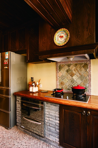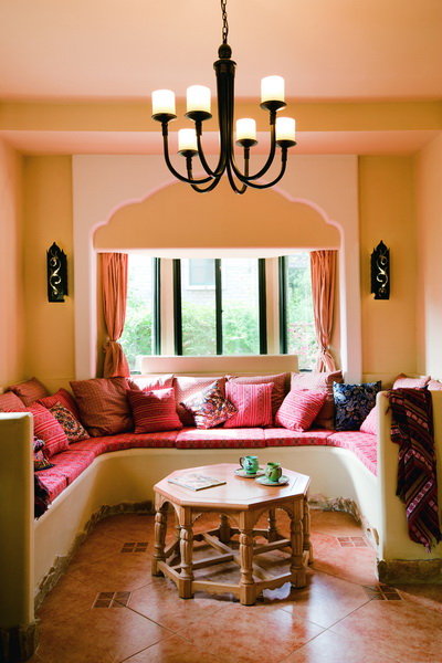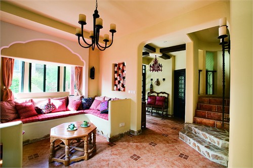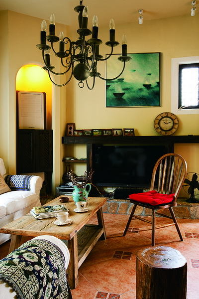 這套別墅的設計風格可以用幾個關鍵詞來概括:做舊,妖艷,混搭,原生態(tài)。主體風格是地中海風格,地中海風格中的一些基本元素運用的非常巧妙,比如圓角,拱形門洞,馬賽克,仿古磚,毛磚,鐵藝等等,其中還有幾處非常大膽的設計,那就是一樓酒吧區(qū)域的吧臺用了一整樹作為支撐,給人的感覺就是特別原生態(tài),但不突兀。同時廚房的臺面也用了非常少見的實木臺面,與廚房的木質做舊的頂面形成呼應。說到妖艷就不得不說這套房子的顏色運用,墻面整體顏色是淡淡的黃色,二樓的客衛(wèi)則用了傳統(tǒng)的中國紅涂料,主衛(wèi)一個紅色的浴缸與新砌的馬賽克貼面的淋浴房形成強力的對比,一新一舊,現(xiàn)代與古樸。