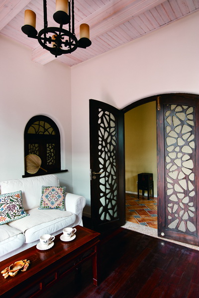 三樓的拱形門采用的綠色做舊,自然而不夸張。樓梯的鐵藝欄桿也非常特別,每一樓層都有不同的造型,婀娜多姿。還有幾處窗和主臥的大門,是用炭燒木雕花制成,造型別致純樸。