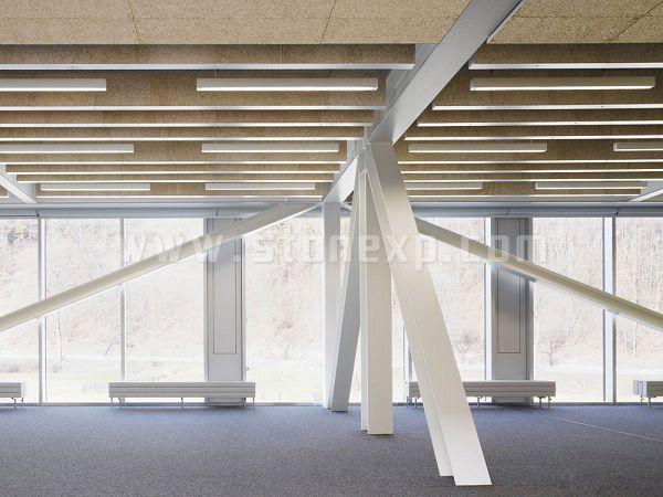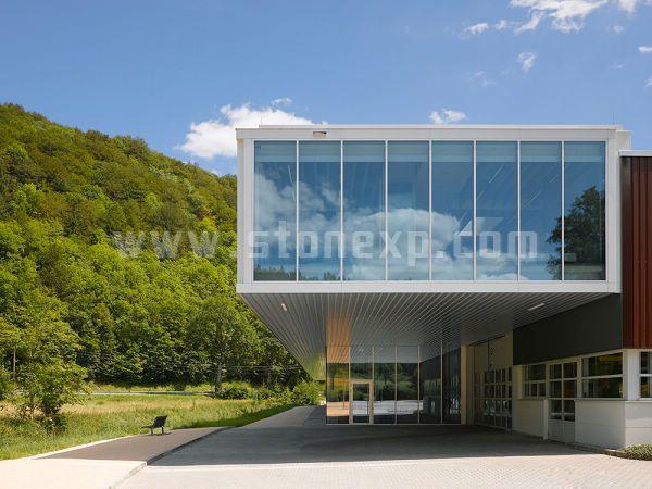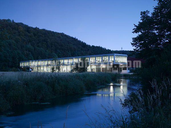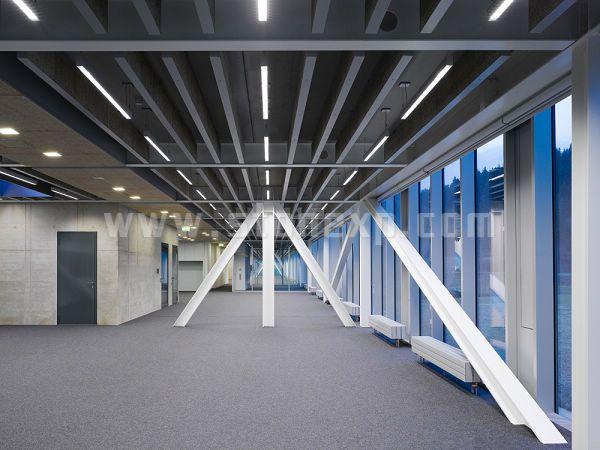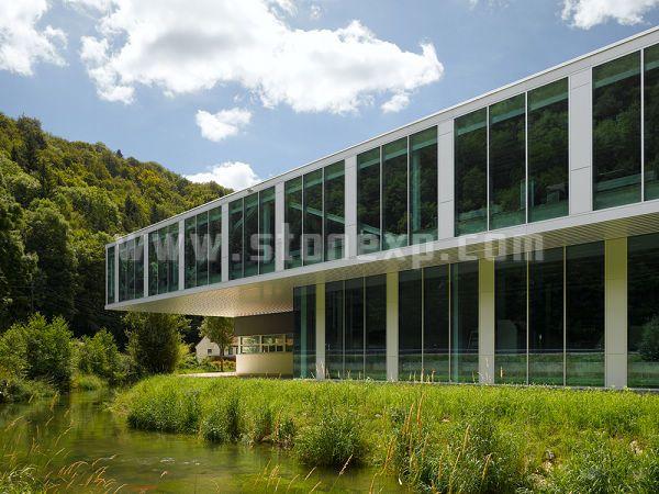 Trumpe公司1500平方米的擴(kuò)建項(xiàng)目位于德國斯圖加特南邊,斯瓦賓阿爾比山中的小村莊黑廷根。建筑身處森林、裸露的巖石和蜿蜒的Lauchhart溪流描繪出的風(fēng)景如畫的山谷中。擴(kuò)建部分像個(gè)大壩,迎著北側(cè)的山谷擋在現(xiàn)有建筑的前面,也成為了整個(gè)村莊的北側(cè)邊界。北立面面對(duì)一片不得進(jìn)行建設(shè)的自然保護(hù)區(qū)。