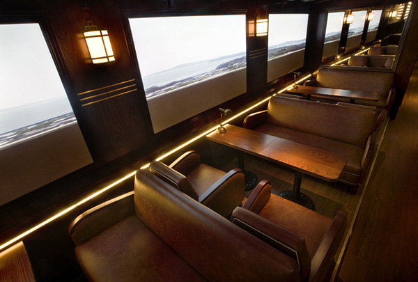 The Passenger(乘客)是一家西班牙的主題餐廳,位于馬德里,可容納150人就餐,整個餐廳被布置成了老式火車車廂的樣子,使用了大量暗色的皮革和做舊效果的木材,餐桌狹窄。特別之處是寬大的“窗戶”其實是平板顯示器,不斷播放流動的畫面,營造出乘坐火車旅行的感覺。整體設(shè)計來自西班牙藝術(shù)家Franger。