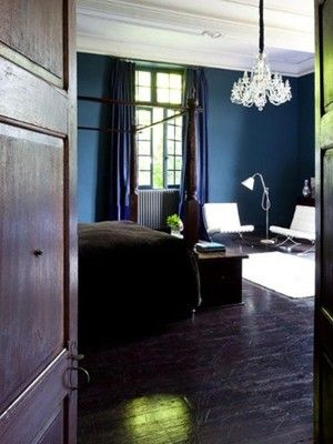 編輯點(diǎn)評:這款臥室的色彩相對來說較厚重,深色的木質(zhì)地板和深藍(lán)色的純漆墻壁將色調(diào)拉了下來,但也有些許白,在空間里十分地惹眼。