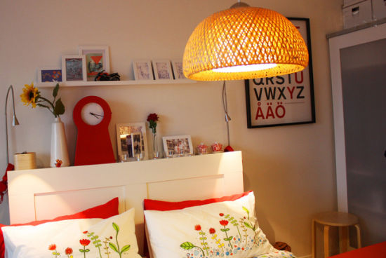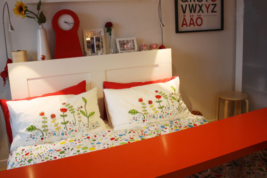溫馨質(zhì)樸的編織藤吊燈為整個(gè)家打下了一個(gè)橙黃色的基調(diào),是女主人最喜歡的,床頭的裝飾也是花了不少心思,為了讓家更加的溫馨,簡(jiǎn)單的層板上擺放著大小不一的各種圖案的相框,床屏上的紅玫瑰和向日葵都是兩個(gè)人一塊買的,能看的出兩個(gè)人對(duì)生活很有品味,很熱愛生活。