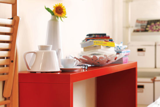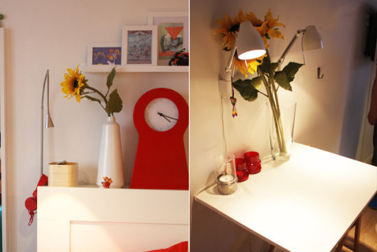 都知道向日葵的花語是“沉默的愛”,正因?yàn)檫@樣,兩個(gè)人都特別鐘愛向日葵花,在家中的小小空間里隨意都可以看到它們的存在??繅t色的簡(jiǎn)約家具是電視柜,漂亮吧,最喜歡它的顏色,可以做邊桌,也可以是書桌,看桌子上的那些書,是女主人喜歡看的書。