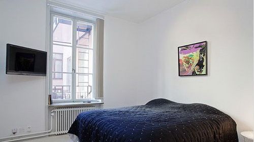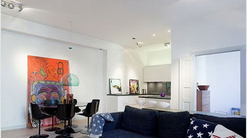 臥室采用了深淺兩色的對比分割,大膽而利落。其整體布置也非常簡單,最大限度地保證了空間的輕快透氣。沒有任何裝飾的平板床使空間不顯繁冗,色彩豐富的裝飾畫打破了房間的單調(diào),為臥室增添了幾分活潑氣息。