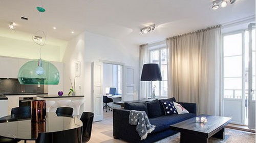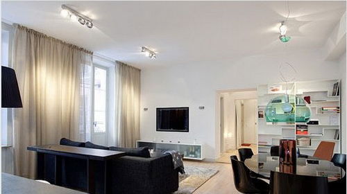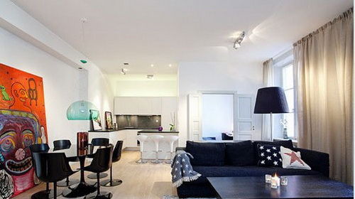 沙發(fā)區(qū)和就餐區(qū)里的深色家具,與白色的空間基調(diào)背道而馳。一深一淺的強(qiáng)烈對比,將人們的注意力更多地放到了空間的對比上,而忽略它本身分割空間的作用。