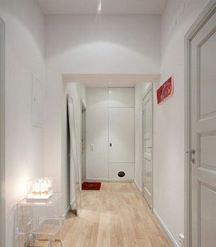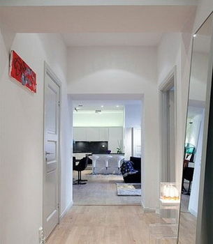 居室的門廳部分相對較窄,為了防止產(chǎn)生擁擠的感覺,戶主運(yùn)用具有反光效果的白色墻漆進(jìn)行視覺擴(kuò)充。而在狹長的走道里,一塊斜放的細(xì)長鏡面也有效延展了視覺空間。
