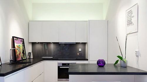 白色烤漆材質(zhì)與黑色臺面的深淺搭配,讓廚柜展現(xiàn)出變化的層次感。為了給空間里營造一些亮點(diǎn),用色彩強(qiáng)烈的涂鴉畫、琉璃器皿及綠植點(diǎn)綴,不僅成功營造了視覺焦點(diǎn),也讓黑白分明的廚房主題得以更好展現(xiàn)。