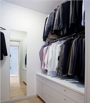 帶有很多抽屜柜的衣帽間,配以整齊的衣物排列,給人感覺方正而有條理。無論是懸掛區(qū),還是衣帽間里的雜物區(qū),在這個狹小的空間里,襯衫、西服、領(lǐng)帶和被子等都被安置得妥妥帖帖。