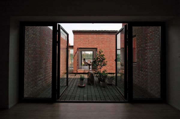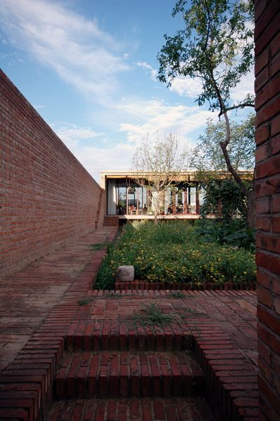 建筑形體以看似松散平淡的方式嵌入到環(huán)境中,實(shí)則將基地周邊的主要特征(水面和植物)通過鄰借、映襯狀形傳意等方式逐層地誘入并滲透到建筑內(nèi)。建筑皆分而綿連、隔而不斷;“水面”、果樹、菜地等田園要素包裹或穿插其間,營造出各種功能空間的不同開放感。